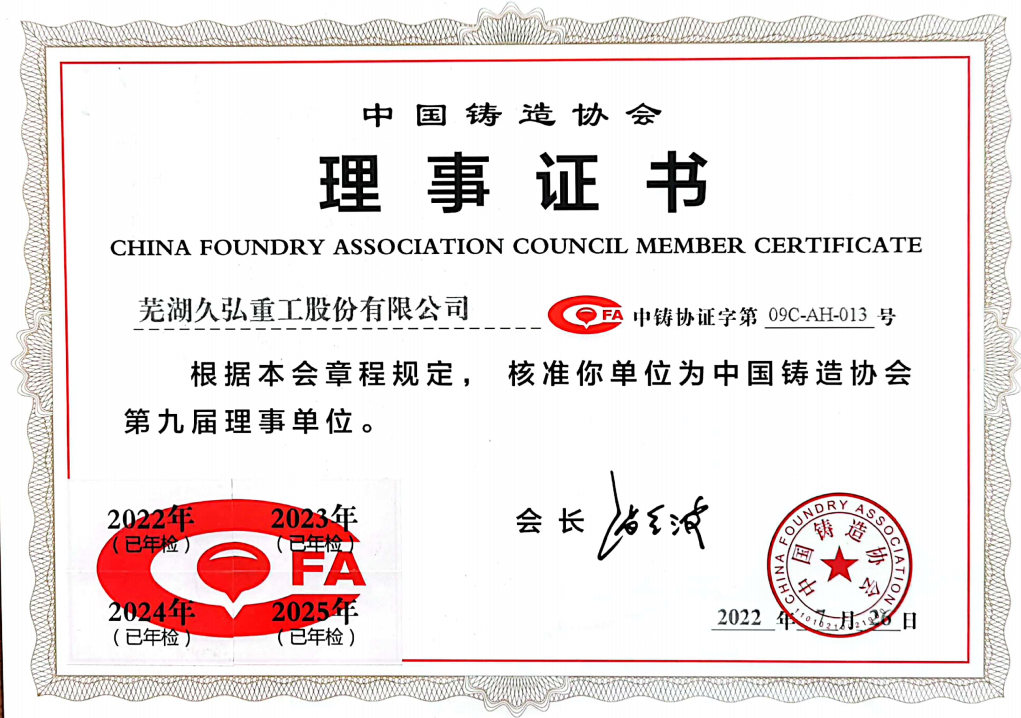 中國(guó)鑄造協(xié)會(huì)理事單位證書(shū)